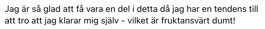 Min störta win hittils är energin jag har fått av att vara med här och motivationen och drivet framåt. Känns som att jag har en mycket tydligare bild över hur jag ska ta mig fram. Det där drömlivet är inte längre något jag hoppas på kommer ske om jag “har tur”. Är numera säker på att jag kommer komma dit!